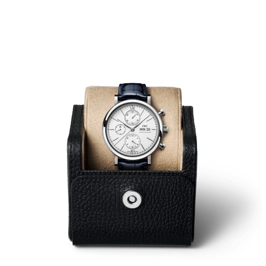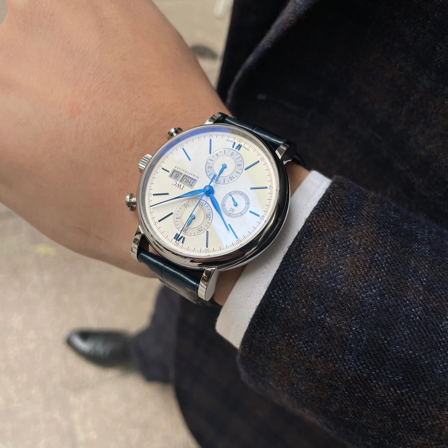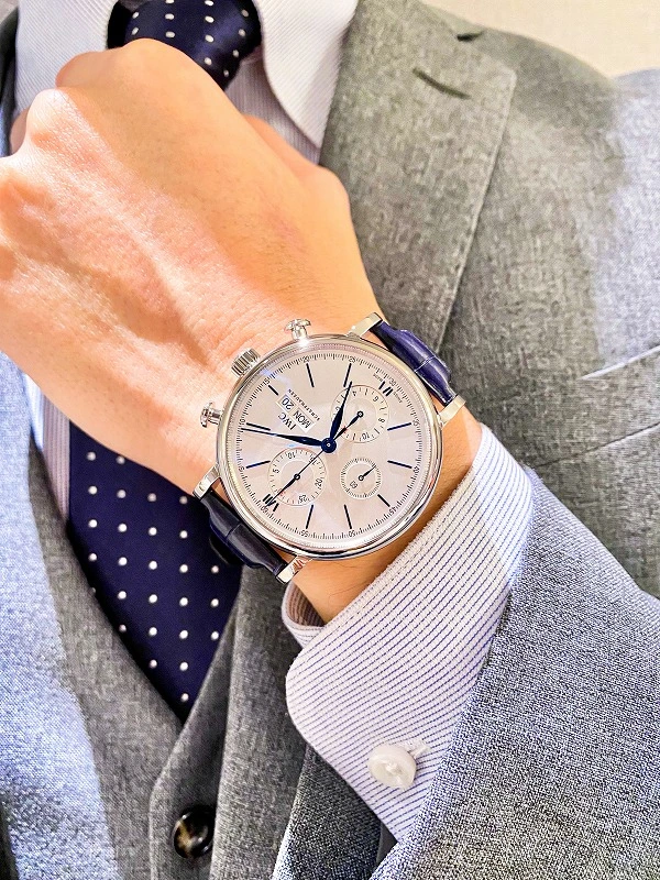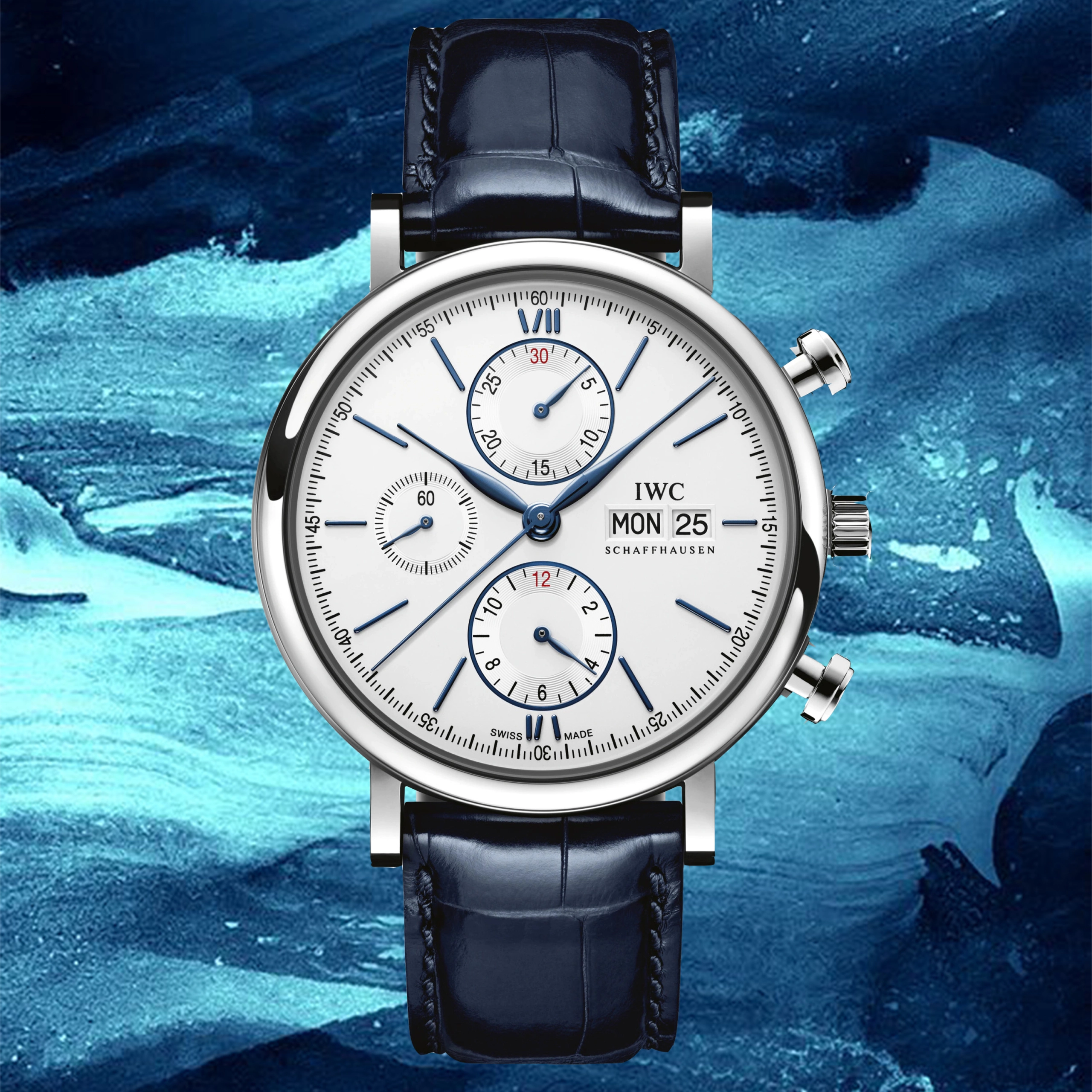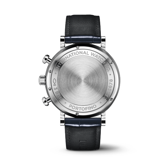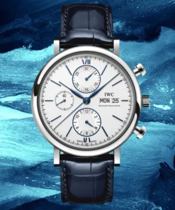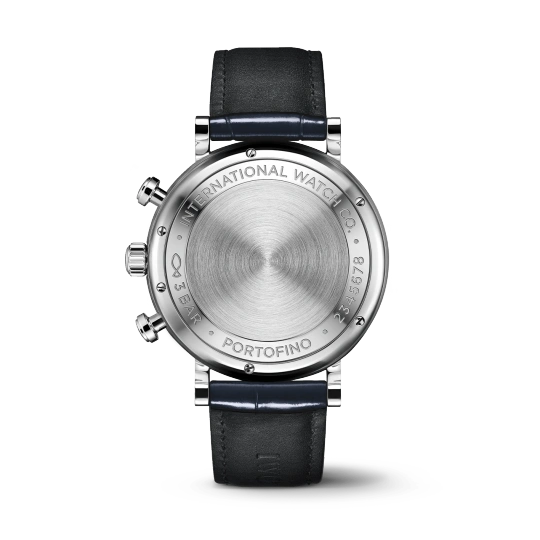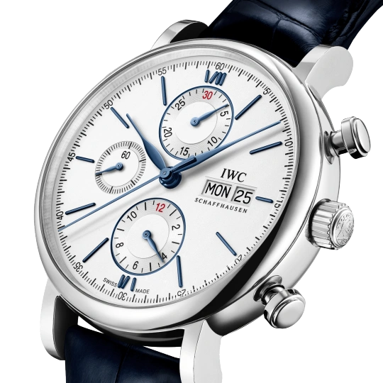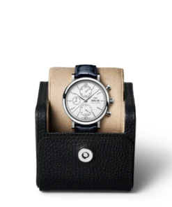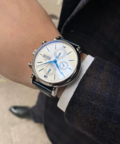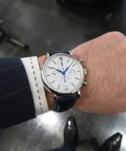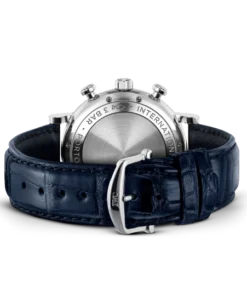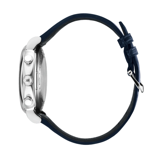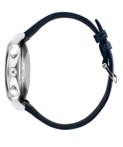 Stainless steel case with blue (alligator) leather strap. Fixed stainless steel bezel. White dial with blue hands and hour markers. Roman numerals appear at 6 and 12 o’clock. Arabic numeral minute markers in 5-minute intervals.